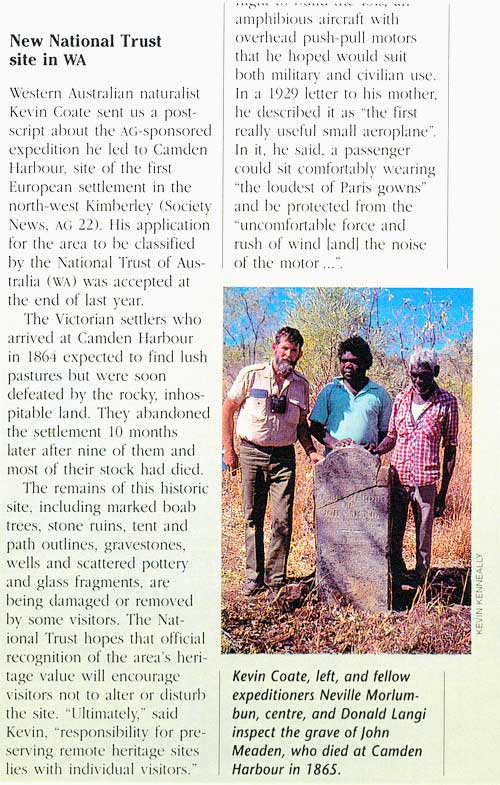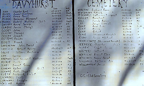 Rest Places: Argyle Homestead, Austin Cemetery, Broad Arrow Kurawah Cemetery, Camden Harbour Kimberley, Davyhurst Cemetery, Foster Glen Farm Upper Capel, Fraser Range Station, Grants Patch, Hillside Station Homestead East Pilbara, Karridale Pioneer Cemetery, Meedo Station, Mt Florence Station, Mangaroon Station, Nicholson Station, Onslow Pioneer Cemetery, Ord River Station Cemetery East Kimberley, Pingin Cemetery, Stokes Inlet Fanny Cove, Wickepin Pioneer Cemetery, Wurarga Dam
