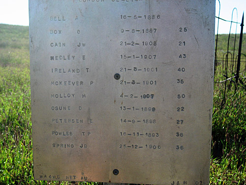 Afghan Rocks on Balladonia StationArthur Creek StationARTHUR RIVERArthur RiverAshmore Reef Bamboo CreekBamboo Creek East PilbaraBangemall Bangemall Beverley BindoonBindoon Bonney Downs Station East PilbaraBroome - DerbyBrowse Island Kimberley coast Calingiri Cape Bossut on Kimberley coast Cape Bossut on Kimberley coastChristmas Island Condon Cemetery Plaque Coolgardie Pioneer CemeteryCoolgardieCorunna Downs StationCranbrook on Tambellup RoadCroydon Goldfield CemeteryCroydon Goldfield Cemetery Croydon Goldfield CemeteryCroydon Goldfield CemeteryCroydon Goldfield CemeteryCroydon Goldfield CemeteryCroydon Goldfield Cemetery mapCue unregistered cemeteryCue unregistered cemetery Cue unregistered cemeteryCue unregistered cemeteryCue unregistered cemeteryCue unregistered cemeteryCue unregistered cemeteryCurrans FindCygnet BayCygnet Bay