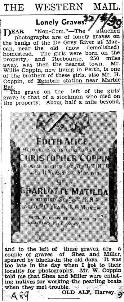 COOPER John AstleyCOOPER John AstleyCOOPER John AstleyCOPPIN Edith Alice & Charlotte MatildaCOPPIN, Edith Alice, Christopher & Charlotte MatildaCOPPIN, Edith Alice & Charlotte Matildac 68 COPPIN Edith Alice Charlotte Matilda buried Muccan Station East Pilbara Photo Ruth John Luyer 2003 150x150CORNELLY, FarrellCORNELLY Farrell, DORAN, Moreton (largest headstone) & BRAND babyCORNISH, Arthur BCOSSAR Kevin GraemeCOSSAR Kevin GraemeCOTTER MauriceCOTTLE, Elizabeth MayCOVEY, FrancisCOWIE Andrew LeeCOWIE Andrew LeeCOX, Daisy & NellieCOX Family Burial Ground COX WilliamCOXON James COXON JamesCOYNE babyCRAIG RobertCRAIG RobertCRAWFORD, JohnCREAM Mary JaneCREAM Mary JaneCREAM Mary JaneCRECHAN ThomasCRECHAN ThomasCROCKER AmyCROCKER AmyCROTTY James HenryCROWSON June VioletCUFF Kevin Harcombe & RIX SidneyCULLANE FatherCULLANE Father