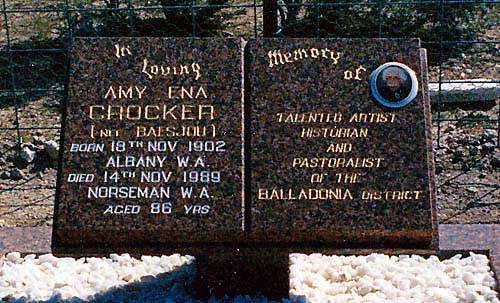Resting Places:  Ashburton, Augusta Pioneer Cemetery, Balladonia Station, Bangemall, Broom Pioneer Cemetery, Cobra Station, Cygnet Bay, Flora Valley Station, Garden Well Wilsons Patch, Goongarrie Cemetery, Louisa Downs Station, Lynton, Mardella, Mertondale Cemetery, Morawa, Mount Newman Cemetery, Muccan Station, Newdegate, Night Well Ongerup, Springhill Private Cemetery