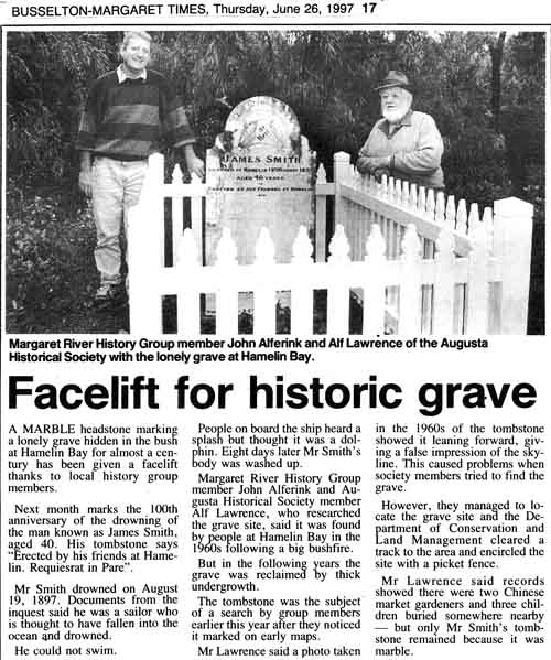 Rest Places: Ben Dhue Station East Pilbara, Broad Arrow Kurawah Cemetery, Condon Cemetery, Cull Culli Station Cemetery, Davyhurst Cemetery, Gordon Downs Station, Hamelin Cemetery Karridale, Henley Brook, Israelite Bay, Margaret River Station near Halls Creek, Markegin, Meentheena Station, Meka Station, Mt Newman Cemetery, Mourambine Churchyard, Mulline Cemetery, Mundrabilla Station Nullarbor Plains, Onslow Pioneer Cemetery, Uaroo Station Cemetery, Upper Swan, Well 49 Canning Stock Route