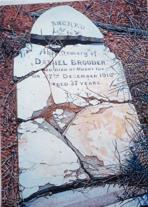 This image (left) is taken from a water colour painting by Ian Coate for the cover of Yvonne & Kevin Coates' book, "More Lonely Graves of Western Australia", which is available from Hesperian Press. Ian is the son of Yvonne and Kevin and is an accomplished artist and illustrator. Click the following to link to the Art and Illustrations of Ian Coate and the Lonely Grave book cover illustration